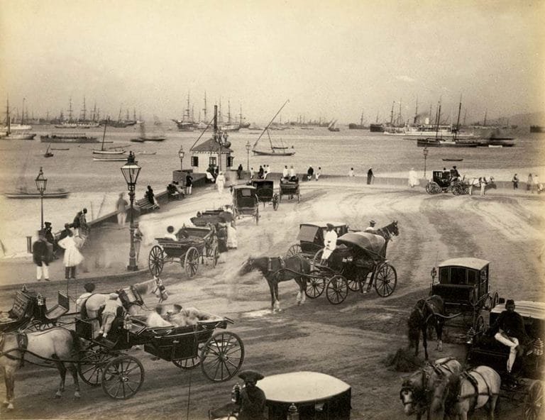 Bombay became a vibrant trading junction with the arrival of enterprising communities and the development of its harbour into ports. Photo Courtesy: The Early Bombay Photography, Collection of Gopal Nair, View of the harbour (from Apollo Bunder) - Bombay, c. 1880s: Page 104
