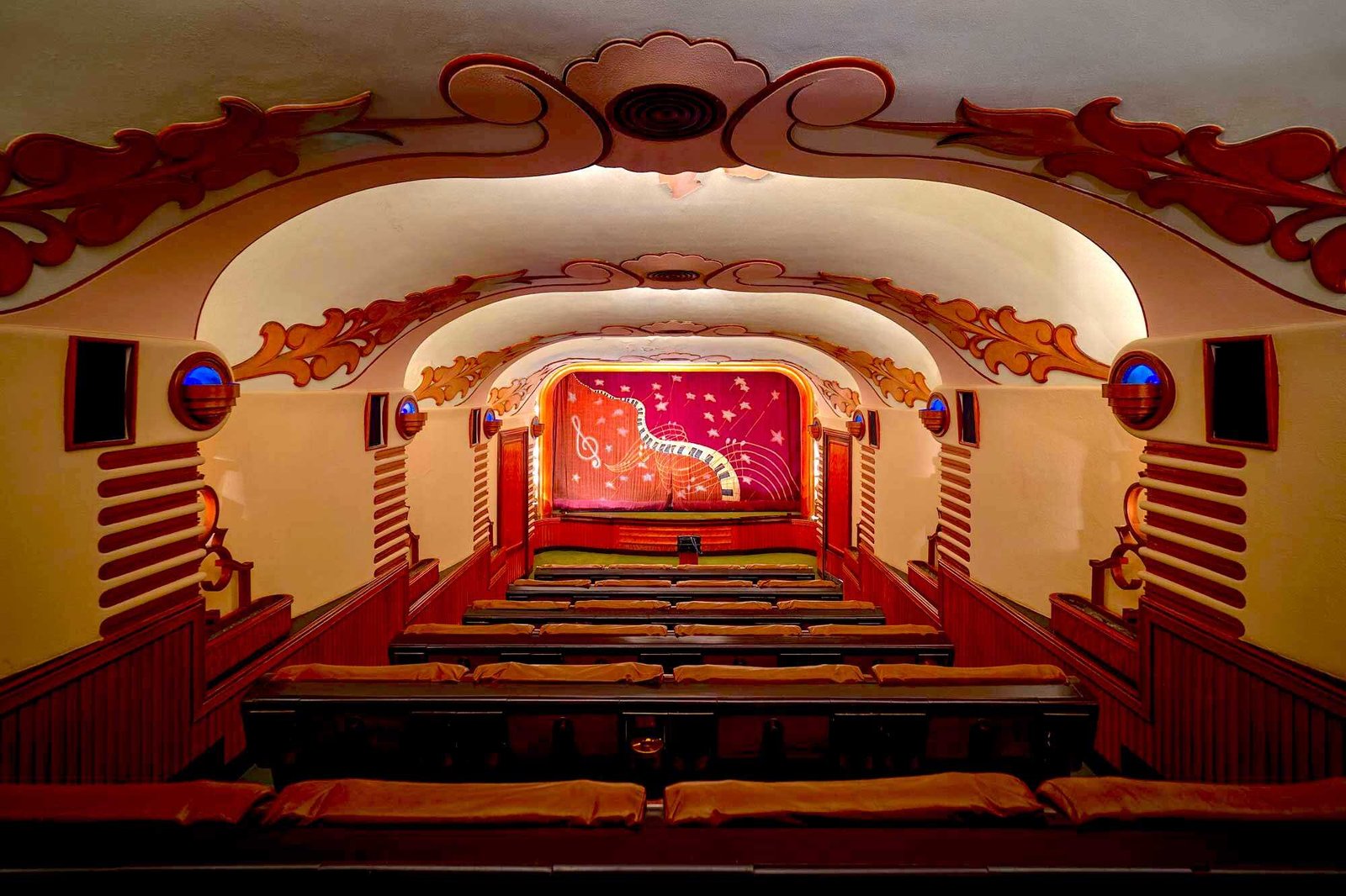 Curiously, since I have photographed his very first cinema theatre (Chhaya 1938) and his last (Raj Mandir 1976) and 16 in-between, I have observed an evolution of his style, and the perfection of the recurring motifs and preferences of the artist. The frozen fountains were one of his favourites, as were the circular relief lighting alcoves, and the layered walls and ceilings of his auditoriums. The layered walls and ceilings evolved from his obsession for acoustics, and provided him with an unusual way of creating lighting dreamscapes with concealed bulbs, highlighting the shapes, outlines and relief work, and successfully creating tremendous depth in these spaces. His spaces look cavernous and are softly and shadowlessly illuminated. And with his love for deep pile carpeting, the result is a lush and rich atmosphere.