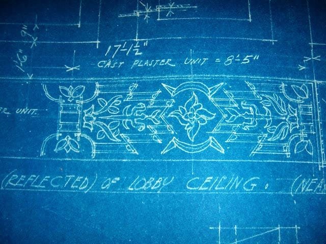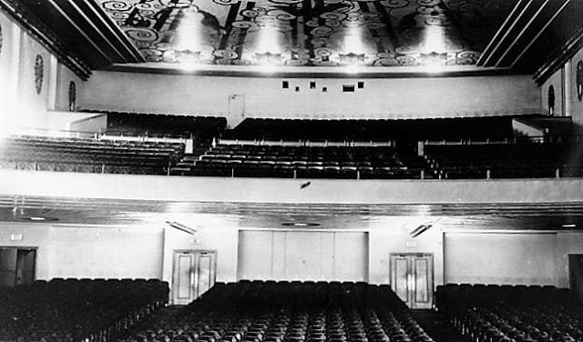 Several murals and frescoes adorned the ceilings and walls of the auditorium and the mezzanine floor, which brought an air of luxury to the theatre.[12] The auditorium’s tiered flooring and balcony seats provided every comfort necessary for watching a movie without obstruction in one’s line of vision. The Landmark designation report described the spaces as “richly toned” interior appointments, including a “gallery of mirrors” extending the height of the sidewalls, and “luxurious smoking rooms and cosmetic salons and other conveniences for modern patrons of fastidious temperament.”