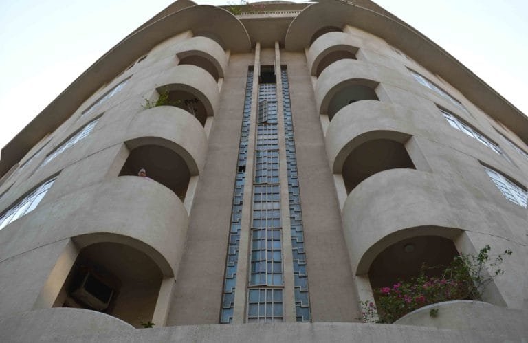 Rao House is a unique Art Deco building in Matunga, with its facade rounding at the street corner. A square shaped staircase tower set at a 45 degree angle to the facade serves as a focal point. Collonaded verandahs with sloping chajjas, quintessential to Bombay’s Deco architecture in response to the local climate, wrap the building’s curved facade. This project, like many others designed by Mhatre, was signed as ‘Poonager and Mhatre’ in its later stage.