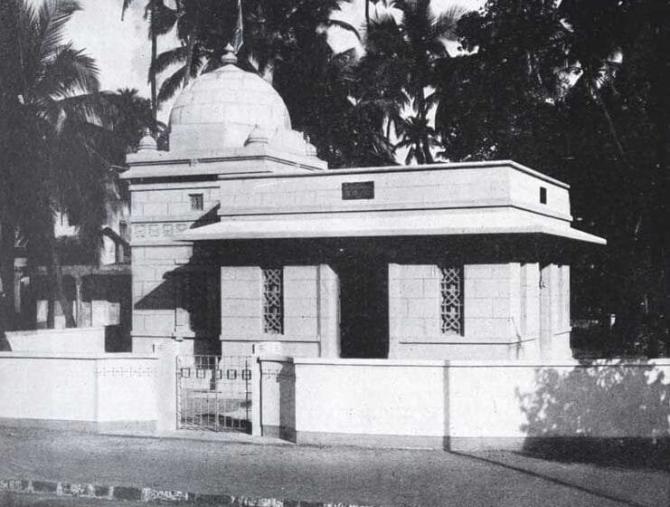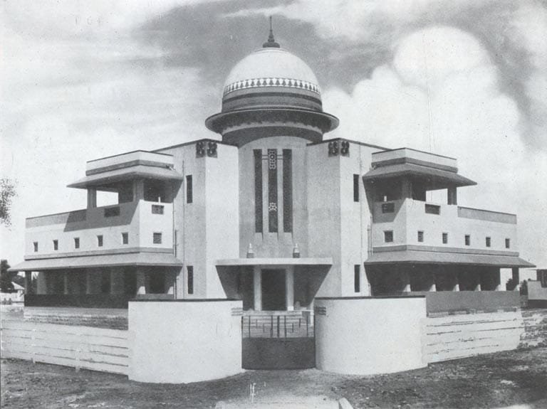 One of many religious buildings designed by Mhatre was the Datta temple in Prabhadevi, built in 1941. This modest temple was designed within the principles of traditional Hindu temple design but with modernist sensibilities, while incorporating traditional elements like the jali, chajjas, and a dome.