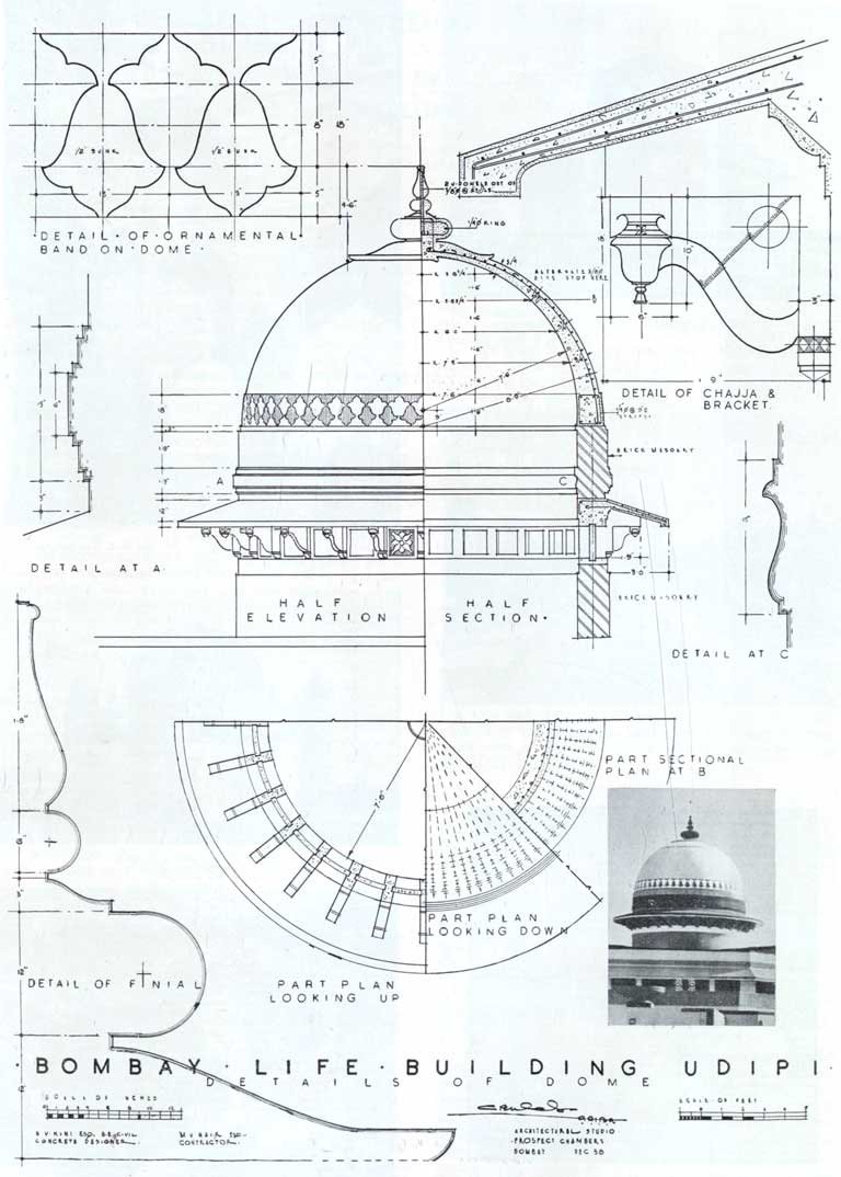 Bombay Life Building, Udipi (Left) and detail drawings of its RCC dome.