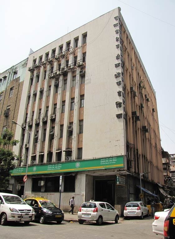 United Bank of India, on Pherozeshah Mehta road (1958) is representative of Mhatre’s work and design style towards the twilight of his career. In contrast to his works during the Deco era, this building is characterized by its minimal, modernist facade clad in travertine, with conspicuous vertical fins. Bronze panels are visible on the spandrels between the recessed windows. The building’s entrance is recessed into the corner, a feature also seen in some of his previous works, like Marble Arch.