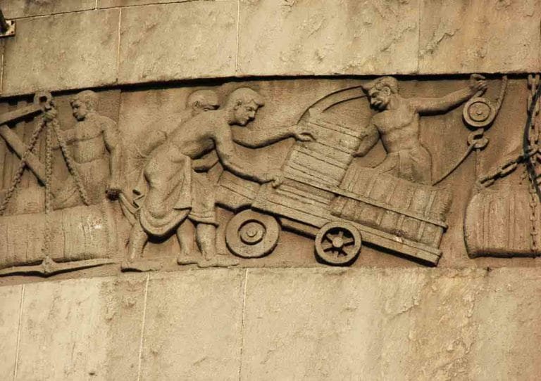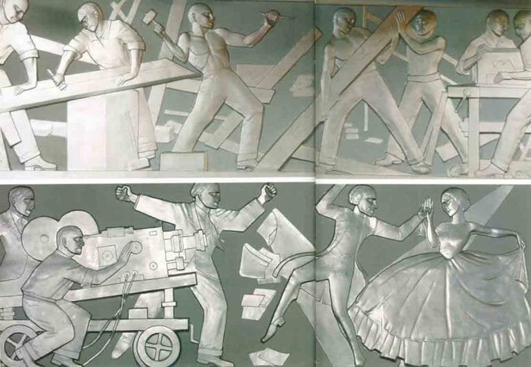 Relief work depicting emotions and occupations such as tragedy, comedy, farmers, labourers, and filmmakers are visible on numerous Art Deco buildings open to the public. These carved decorations use stone or plaster and are angular in design. They reflect cultural practices of the region.