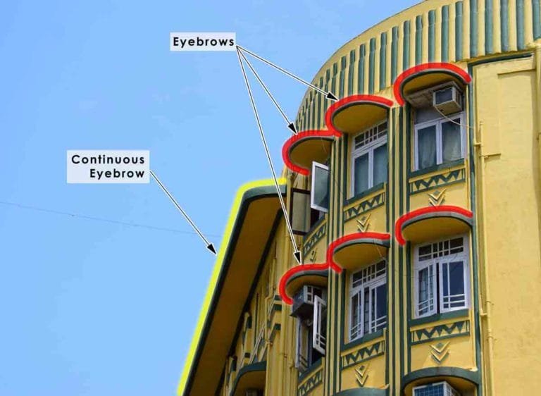 Eyebrows are cantilevered projections above windows and balconies that act as weather shades. These projections, colloquially known as ‘chajjas,’ vary in shape and may be rectilinear, curved, or angular, or may be continuous eyebrows that extend continuously along the building line, emphasising horizontality in the building’s design. They are often painted in a dark contrasting colour along their edges.