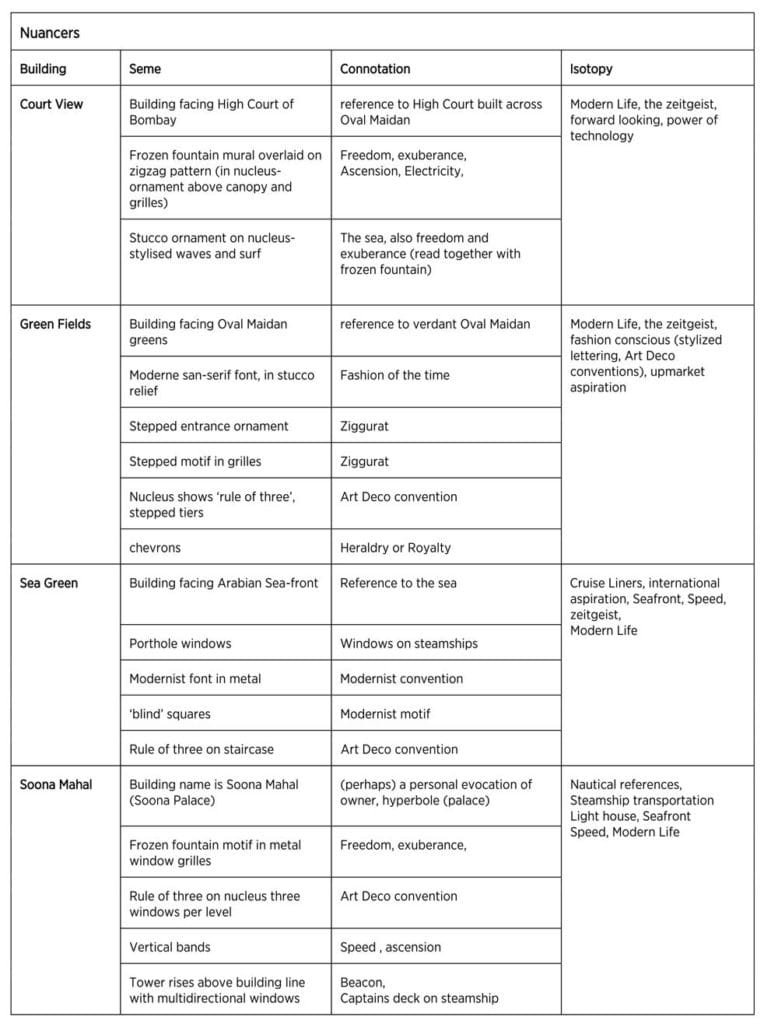 We assert that an ahistoric re-examination, by reading these buildings semiotically as a system of signs, would elicit more useful meanings leading to a better understanding of the architecture of the period. With this in mind, we examine the facades of the Oval Maidan and Marine Drive buildings as agglomerations of semes (basic meaning trait or distinguishing quality) that connote references and concepts that express their age. Using analytical models from visual semiotics (described variously by Saussure, Greimas and Matozzi), we examine the facades as texts, breaking them down for syntax (the order of the elements) and collating the semes to form isotopies (repetitions of traits).