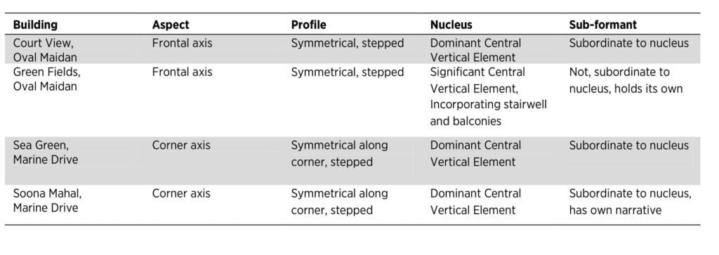 There are however, some variations in the nucleus of each of these buildings. While all are vertical, some dominate the façade whereas others share a more integrated relationship with sub-formants. All the nuclei are stairwell that rise along the axis of symmetry, yet Court View and Green Fields manifest on the front of the façade while Sea Green and Soona Mahal have dominant nuclei on the corners. The sub-formants too vary, ranging from a presence that is effectively back-grounded to the nucleus in Court View and Sea Green while holding its own in Green Fields and Soona Mahal. Each façade, in the case of Sea Green and Soona Mahal appears asymmetrical when seen from one side, or in elevation, with the dominant nucleus at one end.
