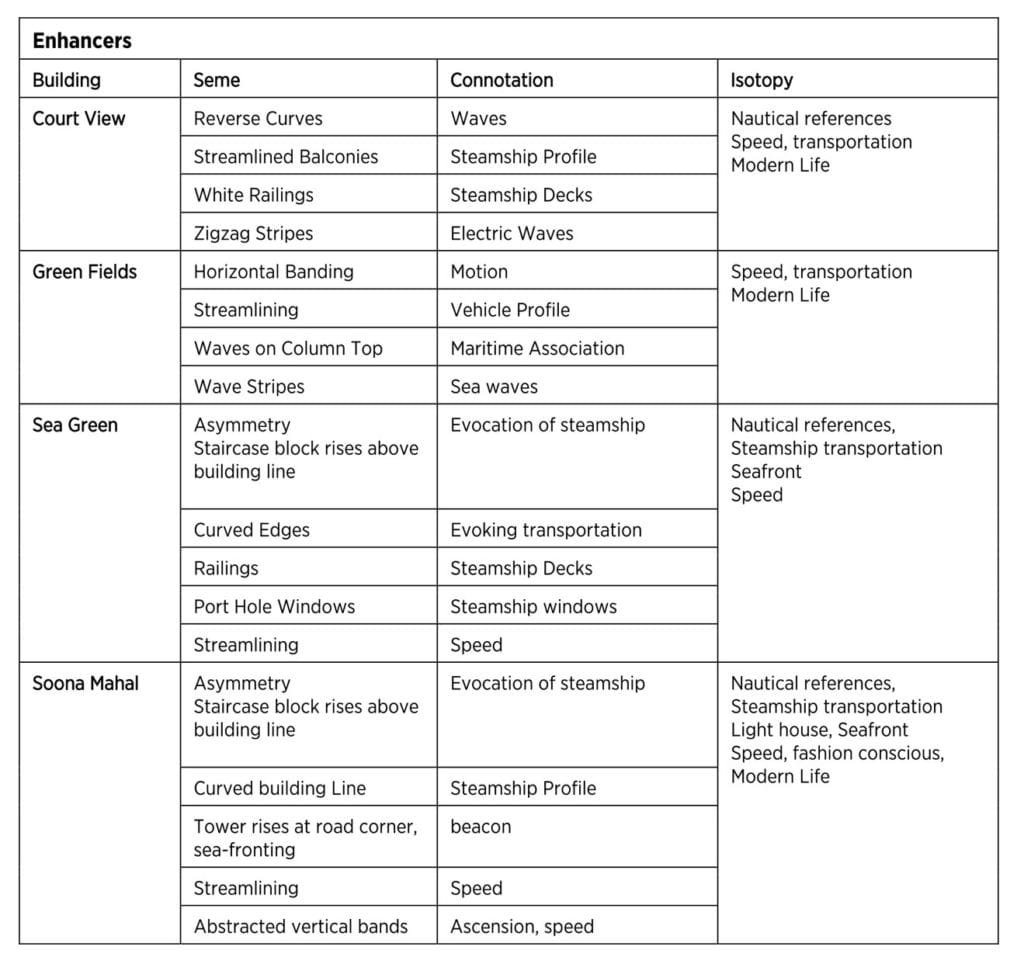 In terms of ornament, the enhancers are much more widespread than the nuancers (see Tables 2 and 3). In the case of the Oval Maidan buildings there is a greater uniformity of the ‘ornamental brief’ and its execution on the facades. In both Court View and Green Fields, as seen, water motifs semes are present overtly as well as subtly in the building forms. On the other hand the Marine Drive buildings, as seen in Sea Green and Soona Mahal, use ornament, sparingly nuanced, but build up the larger scale of architectural form to respond to their position on the seaface.