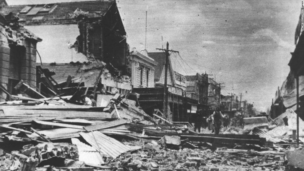 Hit by an unprecedented magnitude 7.8 earthquake, buildings and roads were destroyed, fires roared, and 161 people were killed. The town faced near total destruction.