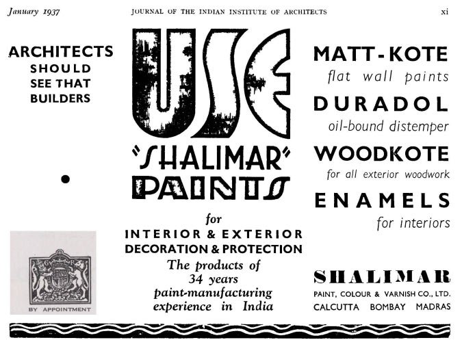 As seen in this advertisement on the left, published by Shalimar Paints in 1937, the various uses of materials like ‘Matt-Kote’, ‘Duradol’, ‘Enamels’ and ‘Woodkote’ have been described in some detail. The company’s versatility is emphasised as the advertisement showcases an inventory that takes care of all paint needs a building may have.