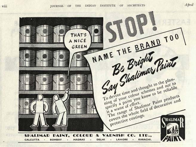 In this advertisement on the right, from a 1937 journal, the tagline ‘Be Bright, Say Shalimar Paints’ incorporates the name of the company to make it synonymous with bright colours and a wide range of shades. There is also a focus on their paint manufacturing experience.