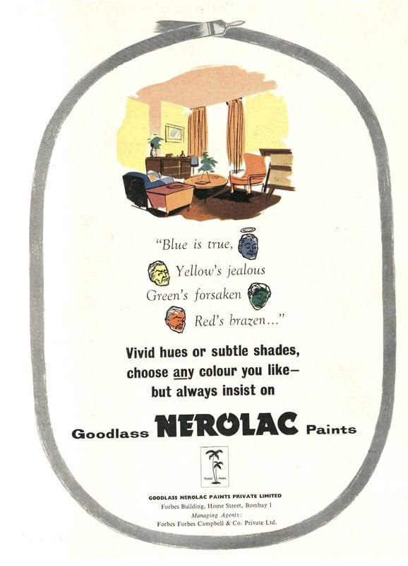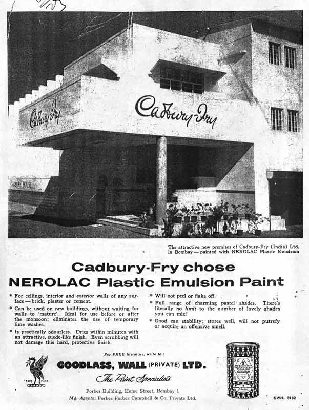 Companies like Goodlass, Wall Ltd. also showcased the buildings painted by them, highlighting the functional qualities of the paint finish. An advertisement from a 1957 journal, for instance, displays the Cadbury Fry building (since demolished), which was a famous landmark at Bhulabhai Desai Road, Mumbai. The advertisement draws special attention to the company’s plastic emulsion paint products and various other characteristics, like durability and an odourless finish. “There’s literally no limit to the number of lovely shades you can mix!” the company goes on to assert.