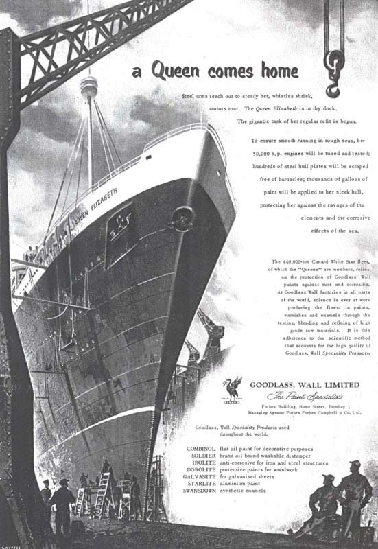 Being the trusted paint of choice for this liner, which offered the ultimate experience in mobility across the ocean, and which received the British crown’s patronage, became the greatest endorsement for Goodlass, Wall Ltd. It was a company that understood modern aspirations of mobility, luxury and efficiency, and was competent enough to bring the “Queen” home, as the advertisement declares. “At Goodlass Wall factories in all parts of the world, science is ever at work producing the finest in paints, enamels and varnishes …” reads the poster.