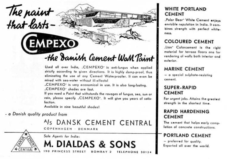 Paint and concrete products continued to be in active use during the 1940s and 50s. As was the case in the preceding decade, every company resorted to building their brand image by amplifying the variety of products, colours, and unique qualities provided by them. Cempexo, for instance, provided different types of coloured cement products supported with properties suitable for coastal areas.