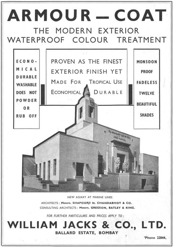 An example of this is the appearance of a waterproof quality in newer paint products. William Jacks & Co. Ltd., for instance, used a photograph of Modern Agiary (also known as NM Petit Fasli Agiary) in Marine Lines, Mumbai, a renowned local marker, as can be seen in the advertisement on the right.