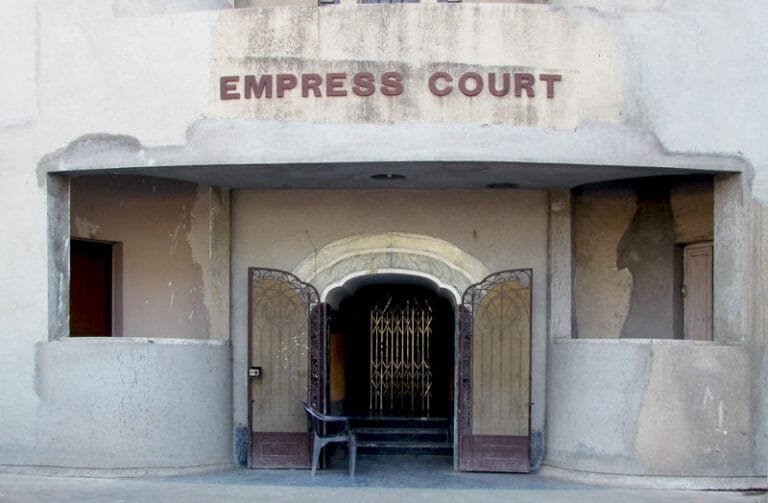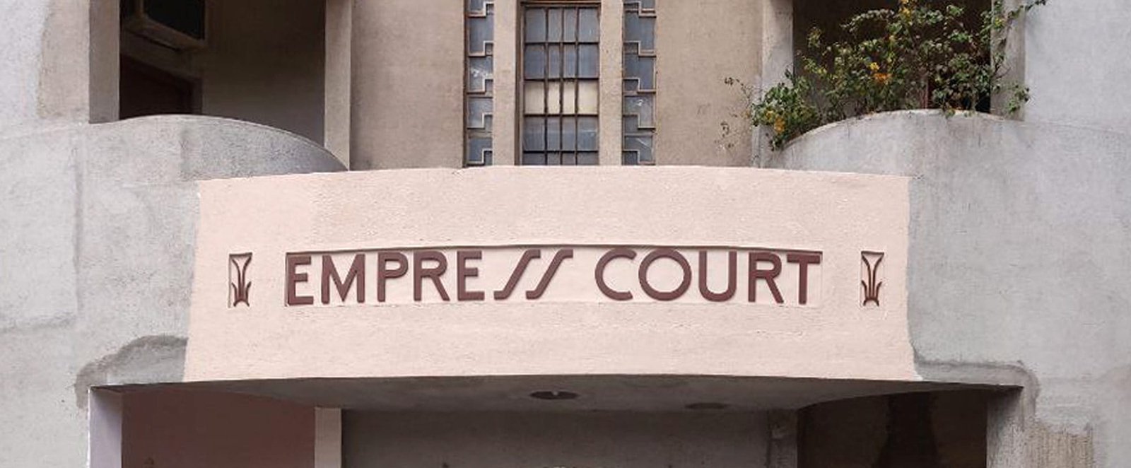 Empress Court, a majestic Art Deco building constructed in 1936, lies along the Oval Maidan in Bombay’s first Art Deco precinct. Built on land reclamations starting in the 1920s, it is part of the 18 buildings situated in this historic precinct, and holds pride of place as a street corner building. It is a prominent part of the Victorian Gothic and Art Deco Ensembles of Mumbai, a UNESCO World Heritage Site. The Art Deco buildings of Oval Maidan were constructed between 1935 and 1940, and have, for the most part, retained their original character, design and essence. Empress Court is no exception.