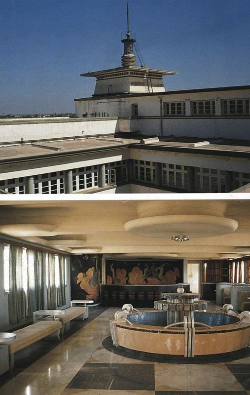The New Palace in Morvi, built for Maharaja Mahendrasinh Lakhdhirsinh in 1943-44, was a pure Deco indulgence.[34] Situated in a relatively small princely state, in the former Saurashtra region of Gujarat, this palace shows a surprisingly strong influence of the classic Deco style in its art, architecture and interiors. Rajkumari Rukshmani Devi, the daughter of the late Maharaja Mahendrasinh, recalls how the prince, having visited America in his early 20s, was enamoured by the style.[35] Designed by Gregson, Batley and King and executed by contractors Shapoorji Pallonji, the palace occupies only one-tenth of an enormous estate measuring approximately 7,500 sq m. Furnishings for it were shipped from an upmarket interiors firm headquartered on London’s Tottenham Court Road, and Polish artist Stephan Norblin was commissioned to decorate it.[36]
