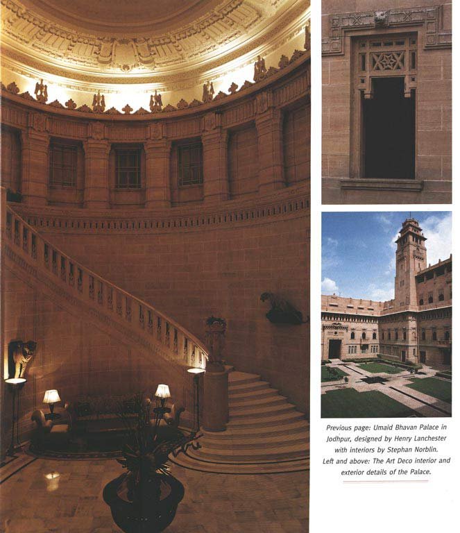The Umaid Bhawan Palace in Jodhpur, commissioned by Maharaja Umaid Singh, yet another iconic Deco influenced structure, is perhaps the most magnificent palace built at the time. Built to employ his people during a state of famine, the palace was designed by architect Henry Vaughn Lancaster as a perfect confluence of tradition and modernity. Spread over a sprawling property of 26 acres at Chittar Hill in Jodhpur, it was once known as the Chittar palace.[39] The monumental sandstone edifice, primarily influenced by traditional indigenous architecture, also has strong visual references to the Deco style in its interiors. The motifs, sculptural elements, furniture and murals all used minimal, streamlined designs. G.A. Goldstraw, L.F. Roslyn and Stephan Norblin were commissioned to design the sculptures, the artwork and the furniture for the palace.[40]