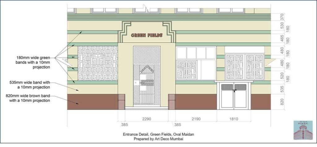 Measured drawing of the entrance facade at Green Fields, Oval Maidan, created by Art Deco Mumbai. Source: Art Deco Mumbai