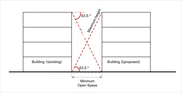 In 1912, a “63.5 degree Light and Air Plane Law” was discussed in the second All India Sanitary Conference held in Madras.[1] This angle dictated the maximum height of a building and the minimum open space to be left as a setback behind the compound wall, as illustrated in Figure 1. Two angles of 63.5 degree could be drawn from the nearest built structure, to derive the maximum height of this building. After extensive debate and discussion, the rule was finally implemented in 1919. [2]