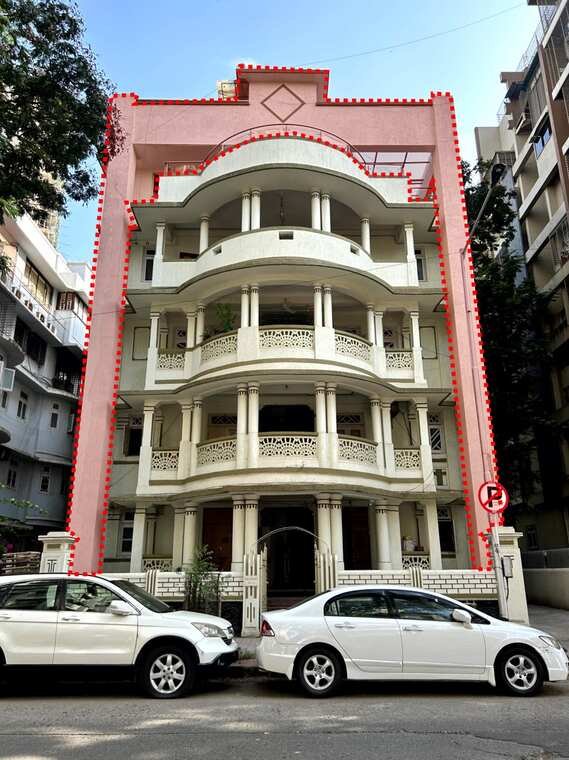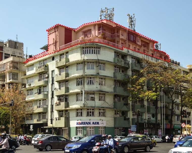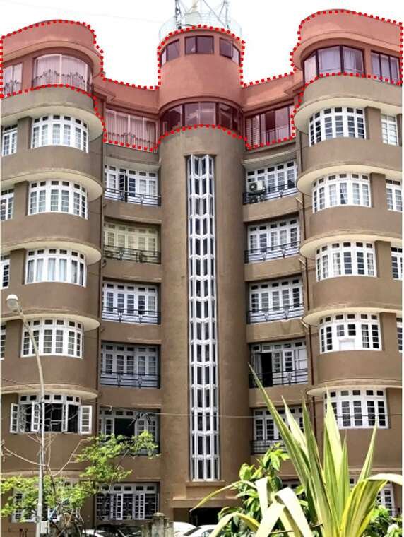 Empress Court, a prominent street corner facing building opposite Oval Maidan, was originally a G+5 structure (as seen in the archival image in Figure 20). The additional sixth floor follows the original building lines, but has a different design in the central portion. Two nautical inspired canopies on the original terrace were lost in the process of this floor addition.