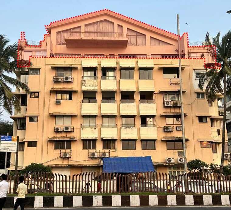 Firuz Ara (Figure 6 below) is a corner building at the junction of Madam Cama Road and Maharshi Karve Road, opposite Moonlight Building at the southern end of Oval Maidan. Two storeys have been added to this building in a haphazard fashion, without consideration for the architectural design or style. Firdaus (Figure 7 below) on Marine Drive stands out due to its addition of a pitched-roof penthouse. No other building on the seafront had such a roof, the uniform flat roof being the norm – a testament to complete disregard for the city’s skyline while constructing an additional storey.