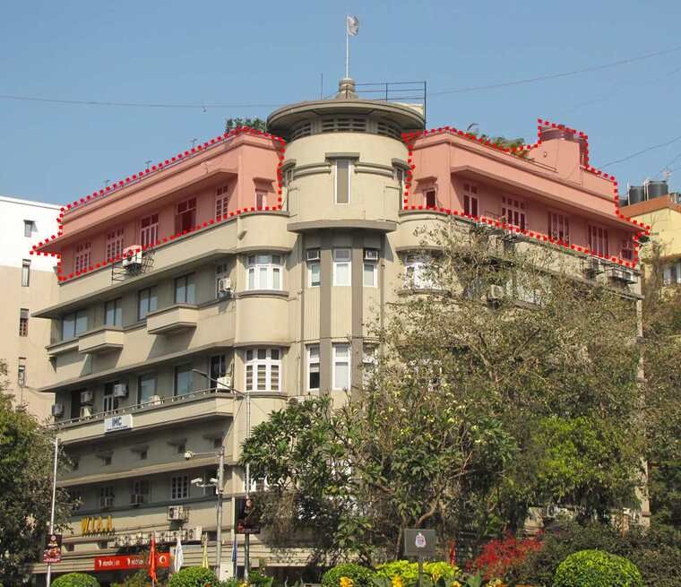 In certain buildings, the added floor is built precisely above the building line of the lower floors to retain the plan profile and building dimensions. In the Indian Merchants Chamber (Figure 3 below), the added floor ends below the roof of the central turret. The floor is easy to distinguish as a later addition; however, it blends with the building line, making it less obvious to passers-by. In Ram Mahal (Figure 4 below), the added floor follows the precise curves of the floor below; the difference is only seen in the windows of the added floor. In Green Fields (Figure 5 below), the sixth floor rises to the level of the crown detail with flutings, and a corner window is replicated, blending the addition with the original building.