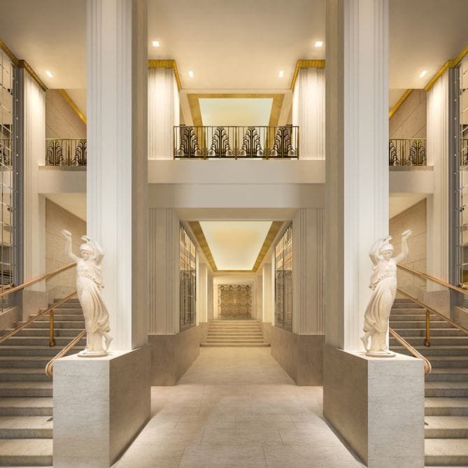 A rendering of what the foyer located near Park Avenue would look like. Several areas of the Waldorf Astoria’s interior, including this foyer, were designated official city landmarks in 2017.(Credit: Skidmore, Owings & Merrill LLP / Rendering by Methanoia Inc.)